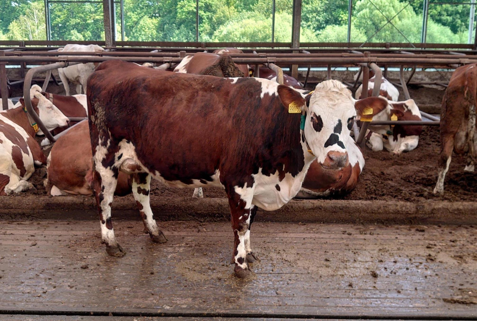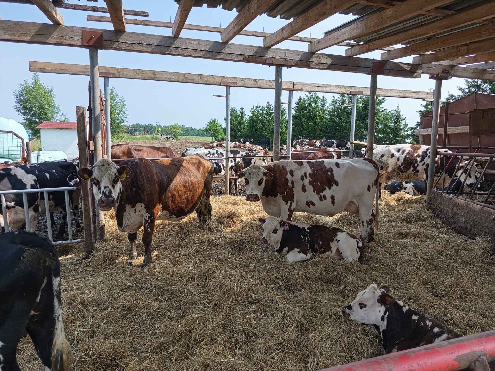 Před pátečním ranním odletem paní Sixtine do Francie nás čekala ještě poslední, pozdní návštěva normandské farmy pana Romana Klouzy v Radimi u Jičína. Zde je dobré předeslat, že se nejedná o BIO chov, ale o konvenční stádo původně červenostrakaté, nyní již barevně úplně normandské, ačkoliv s převažujícím podílem N krve zatím jen mezi 75-88 %. Farma původně na hluboké podestýlce se po prvotním strmém nárůstu produkce mezi lety 2017 a 2021 z 6093 kg na 8673 kg a z obsahu bílkoviny 3,49 % na 3,60 % rozhodla pro velkou úpravu stáje na vodou plněné lehací boxy, a především robotické dojení ve snaze perspektivně vylepšit zvířatům životní podmínky a zvýšit stav. Během tohoto období se věci poněkud zkomplikovaly. Farma se též potýkala s nedostatkem finančních prostředků, takže se práce nakonec protáhly až na 3 roky. Bylo nutno mezitím zabezpečit chov i nouzovými opatřeními. Takto chybějící welfare se významně projevil na užitkovosti, ale i na některých dalších ztrátách v obratu stáda. Během roku 2025 pak postupně došlo k otevření části stáje a podmínky pro zvířata, ačkoliv přestavba ještě není zcela ukončena, se zlepšily. To se i okamžitě začalo projevovat na vzrůstající produkci mléka, takže koncem roku 2025 již nezanedbatelná část dojnic uzavírala laktace na úrovni 10500-13000 kg mléka, což by odpovídalo ambicím chovu. Obecně u nás čistý normandský chov v obvykle intenzivních, konvenčních podmínkách jako ve Francii zatím neexistuje. A tak spící „Šípková Růženka s brejličkami“ dosud čeká na prince, který ji úspěšně provede některou českou verzí klasiky bez pastvy. Roman Klouza je tomu zatím nejblíž. Farma si vybudovala i prodejní automat na některé výrobky. Při naší návštěvě jsme ochutnali naprosto skvělý normandský parmezán. Mléko normandek s téměř výhradním kapa kaseinem typu BB tedy s nejvyšší výtěžností sýřeniny k tomu skýtá skvělé podmínky.